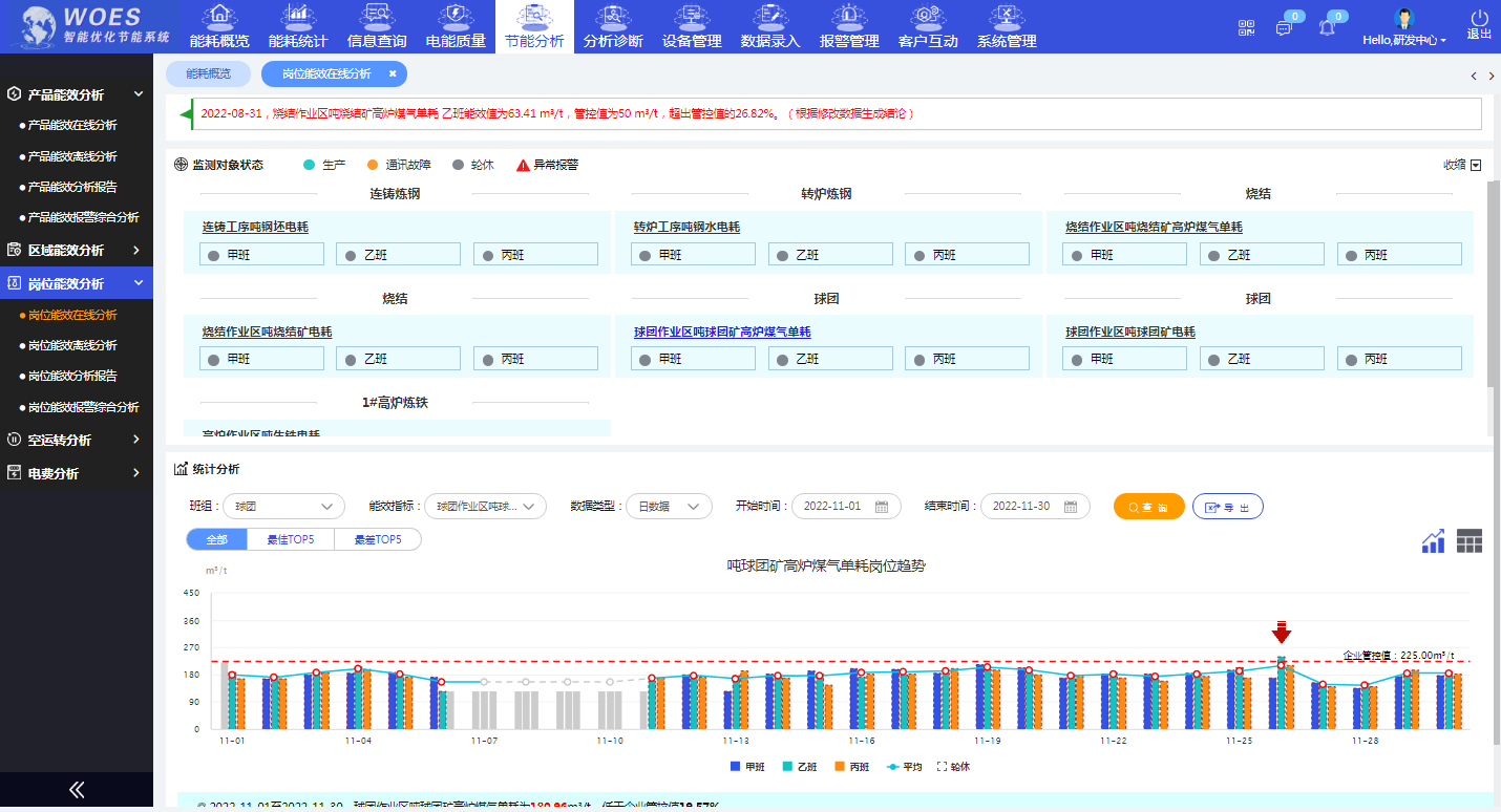 4、班組能效管控考核,提高生產(chǎn)效率、能源使用效率。通過實(shí)時(shí)查看每月每日每個(gè)班組的產(chǎn)量、能耗和單耗情況,系統(tǒng)自動(dòng)開展能效診斷分析,發(fā)現(xiàn)各生產(chǎn)班組的能耗差異。針對(duì)各生產(chǎn)工序(石灰窯、燒結(jié)、球團(tuán)、噴煤、高爐、熱風(fēng)爐、轉(zhuǎn)爐、連鑄、加熱爐、軋鋼)規(guī)分別建立班組能效評(píng)價(jià)考核體系,范員工操作,提高員工節(jié)能意識(shí),實(shí)現(xiàn)年節(jié)約收益120萬元。