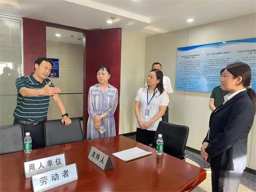 隨后,朱局長一行來到21樓勞動爭議調(diào)解室,雙方就企業(yè)日常和諧勞動關(guān)系的一些做法進行了交流,朱局長分享了竹溪縣人社局開展勞動爭議“三不出”的經(jīng)驗,并探討了在企業(yè)內(nèi)部建立勞動爭議調(diào)解委員會,發(fā)揮企業(yè)內(nèi)部調(diào)解的作用的實踐方法,以減少企業(yè)勞動爭議,和諧企業(yè)勞動關(guān)系,促進企業(yè)和員工共同成長發(fā)展!