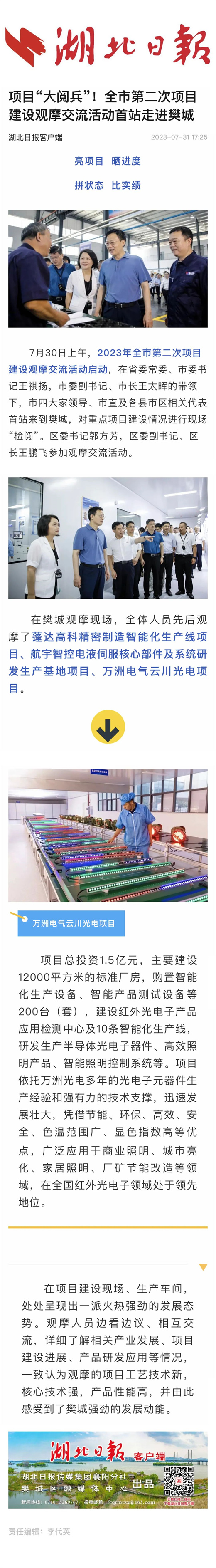 7月30日上午,2023年全市第二次項目建設觀摩交流活動啟動,在省委常委、市委書記王祺揚,市委副書記、市長王太暉的帶領下,市四大家領導、市直及各縣市區相關代表首站來到樊城,對重點項目建設情況進行現場“檢閱”。區委書記郭方芳,區委副書記、區長王鵬飛參加觀摩交流活動。