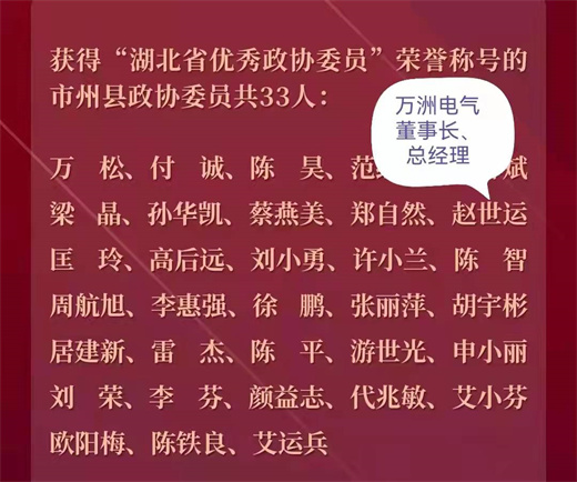 日前,從省兩會獲悉,萬洲電氣董事長、總經理趙世運榮獲“湖北省優秀政協委員”榮譽稱號。在省政協會議上,100名政協委員因履職突出被評為“湖北省優秀政協委員”,其中省政協委員67人,市州縣政協委員33人。趙總作為襄陽市政協委員獲此殊榮。