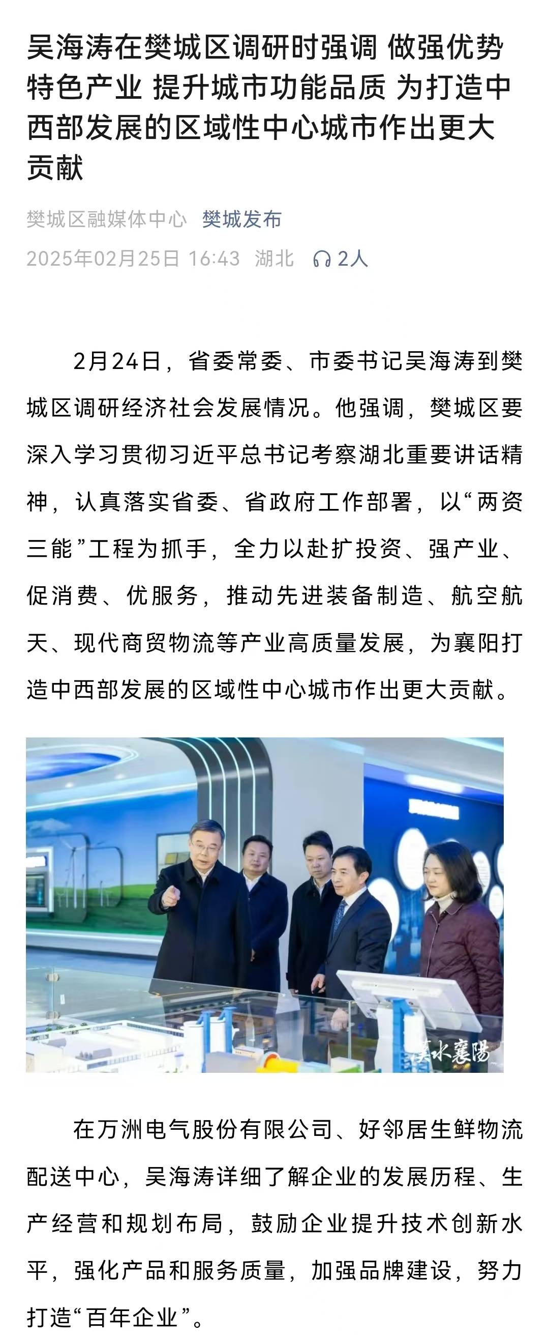 2月24日,省委常委、市委書記吳海濤到樊城區調研經濟社會發展情況。他強調,樊城區要深入學習貫徹習近平總書記考察湖北重要講話精神,認真落實省委、省政府工作部署,以“兩資三能”工程為抓手,全力以赴擴投資、強產業、促消費、優服務,推動先進裝備制造、航空航天、現代商貿物流等產業高質量發展,為襄陽打造中西部發展的區域性中心城市作出更大貢獻。
