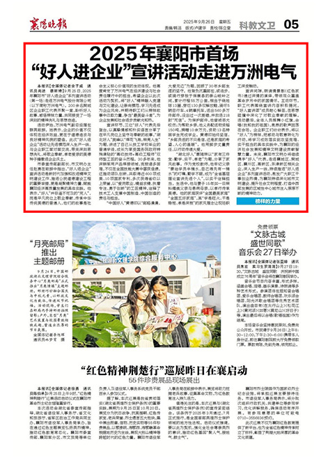為深入學習貫徹習近平總書記關于精神文明建設的重要論述,大力弘揚“三大精神”,充分發揮道德模范、身邊好人等先進典型的示范引領作用,引導廣大企業職工堅定理想信念、提升道德素養、激發奮斗熱情,2025年襄陽市“好人進企業”系列宣講活動(第一場)于9月25日走進萬洲電氣股份有限公司。200余名樊城區企業職工代表齊聚一堂,聆聽好人故事、感悟榜樣力量,共同開啟了一場深刻的精神洗禮與思想碰撞。