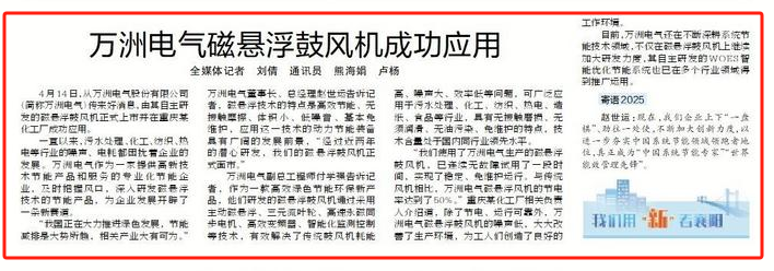 4月14日,從萬洲電氣股份有限公司(簡稱萬洲電氣)傳來好消息,由其自主研發的磁懸浮鼓風機正式上市并在重慶某化工廠成功應用。