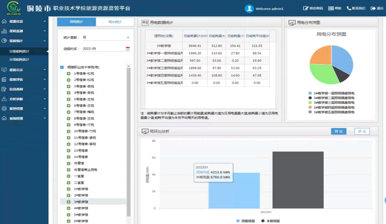 2、優化宿舍用電管理措施,減少能源浪費。學校宿舍樓一共有14棟,通過歷史數據查詢功能發現每天晚上除5號宿舍和9號宿舍在23點之后照明用電量有明顯的下降外,其他的宿舍樓照明用電持續運行到凌晨1點才有下降的趨勢,并未進行管控,學校發現該問題后,通過對宿舍樓進行統一照明用電管理,優化宿舍用電管理措施,避免能源浪費,每年學校宿舍樓節約3.29萬元。