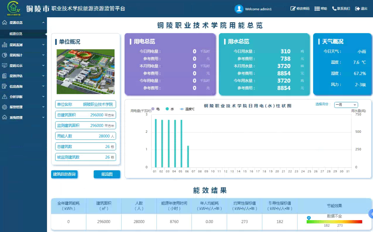 安徽某職業技術學院總建筑面積約21萬平方米,主要建筑為6棟教學樓、14棟宿舍、實訓樓、圖書館、食堂、大學生活動中心等。其中圖書館地下一層為車庫。學院主要建筑均建設于2011年~2012年,維護情況較好。建筑主要能耗形式為水、電;主要用能設備為照明系統、各類空調、辦公系統、教學設備、公共設施等。2021年2月學校部署了一套WBEAS建筑智能優化節能系統。